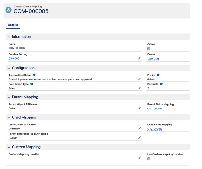 Create Ceretax Mapping Records - Support is extended to objects by creating Ceretax Field and Object Mappings. These tell the integration how to map Salesforce to Ceretax data for request submission and response processing. Example object and field mappings can be seen for the Order object below