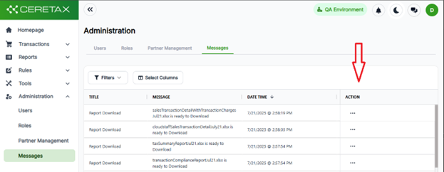 3. On the messages screen, click the … button in the action column, then select download. The download will initiate immediately.